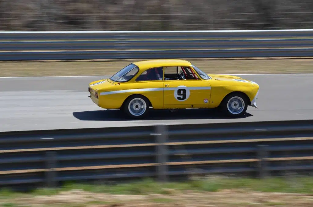 The first-ever OIR race green flag was waved at the top qualifying father-son duo of Erik and Collin Wood, in a pair of beautifully prepared Alpha Romeos. After 20 minutes of family dicing, Erik was able to capitalize on a youthful mistake and pulled away in his yellow # 9 Alpha to also take the checkers. Local Vintage racer Jeff Neathery in his green ’65 Mustang #19 was able to keep pace, but could not quite close the gap, finishing a close second with Collin Wood in the #18 blue Alpha rounding out the podium. A little further back in the pack, two Corvairs were making Ralph Nader go into conniptions, churning out beautiful music from their flat 6’s, and carving up the track piloted by Jeff Moore in the red #15, and Shelby Wood in the white #13 Yenko Stinger Corvair.