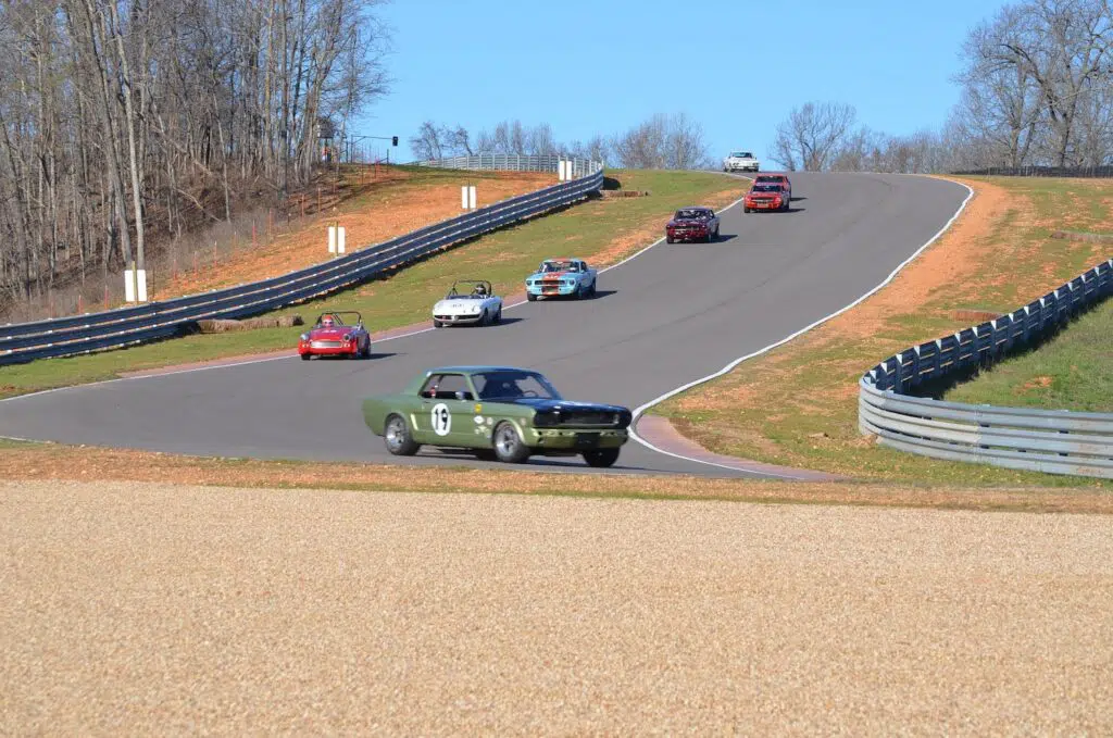 The final race of the weekend Sunday afternoon followed some spectacular fishing and flying from the resident bald eagles. Inspired by their gracefulness in motion, Jeff Neathery and his #19 Mustang were able to prove his track mastery, parrying the challenge from Kent Prather in the white MGA to take the gold and silver respectively. Eric Wood in the blue #18 Alpha held off the hard-charging #28 Boss Mustang of Ronnie Killion at the final checkers. Solid runs by the orange #717 ’66 Mustang of Sean Krieger, the beautiful blue and white #44 Mustang Fastback of Dennis Paul, and the #23x ‘Bama red Mustang of Patrick Stapler, put a smile on the blue oval faithful in attendance. Jeff Melvin in his #63 white Alpha Spyder Veloce and the #45 red MG of Tim McGinley provided a treat for the European Vintage fans, as they marked their territory on the new track.